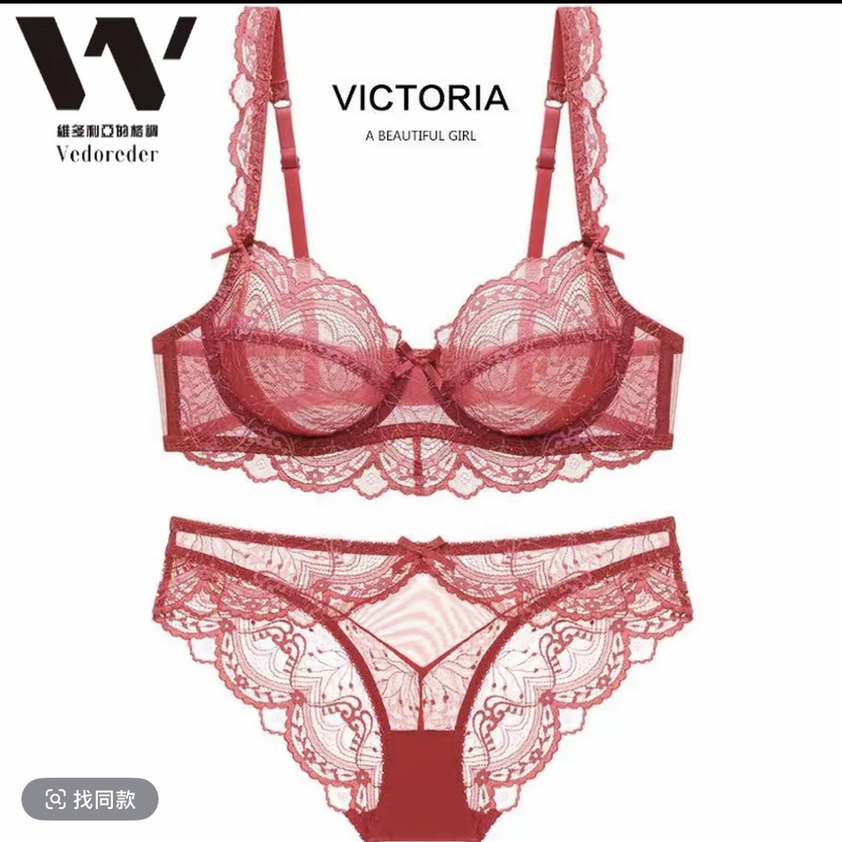 维多利亚性感内衣女夏季薄款大胸显小上托聚拢防下垂蕾丝文胸套装